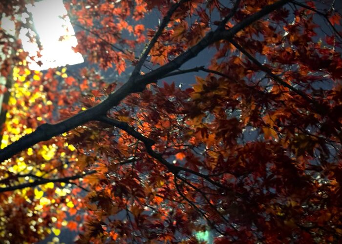 暗闇の中、街灯に照らし出された色鮮やかな樹々はとても幻想的でした。