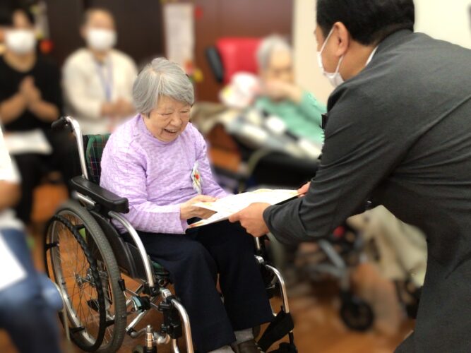 表彰と手作りのお花をプレゼントさせていただきました。最高齢は101歳!