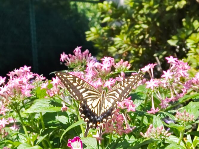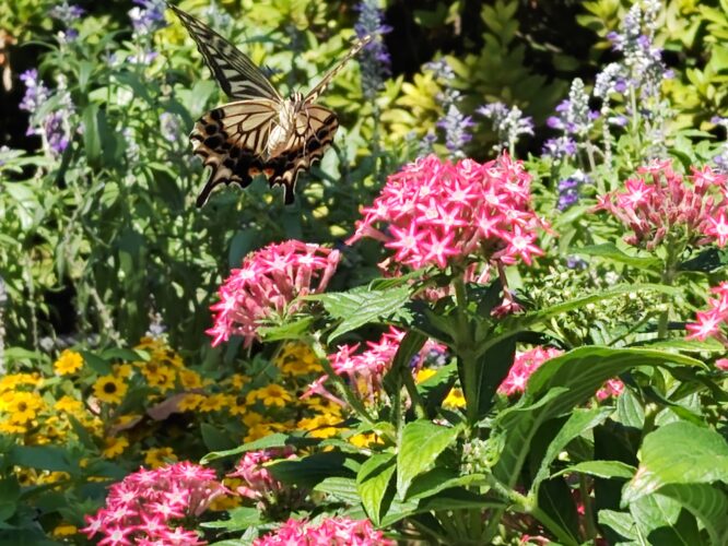 2025.09.23 第3育秀苑地域包括支援センター つつじ山児童遊園の花壇 今年の夏の花壇は会員の方々の細やかな手入れのおかげで、 9月に入っても元気に咲いています。 お花の甘い匂いに誘われてアゲハ蝶が遊びに来ていました。 土支田フローリストの会では一緒に花壇のお手入れや 花壇のレイアウトを考えてくださる会員さんを募集中です。