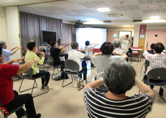 体操では、上半身下半身の運動、耳つぼマッサージ、口腔内体操を行いました。