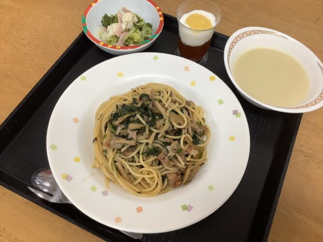 キノコたっぷりのバター醤油スパゲティ、リンゴと紅茶を使用したデザートをご用意いたしました。