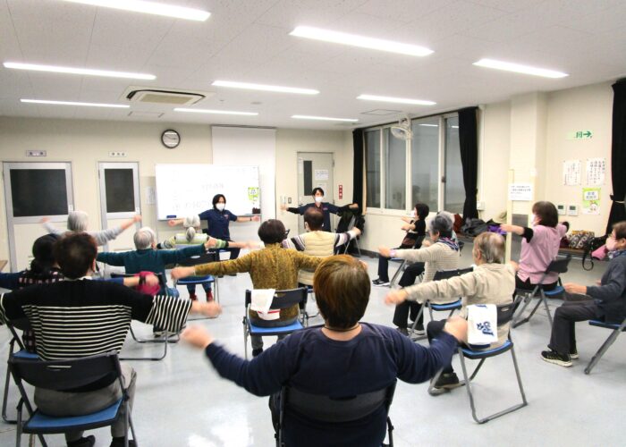 この日は準備体操の後、ヒートショック予防体操、腰痛予防体操を行いました。
