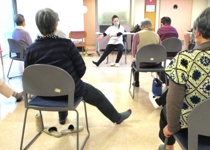 体操では上半身、下半身の運動、耳つぼのマッサージなどを行いました。