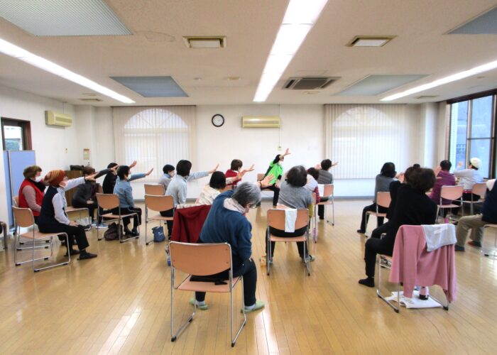 腿上げでは腿を高く上げることに集中している皆さんに、腿を高く上げるより、姿勢を意識するように声掛けがあり、